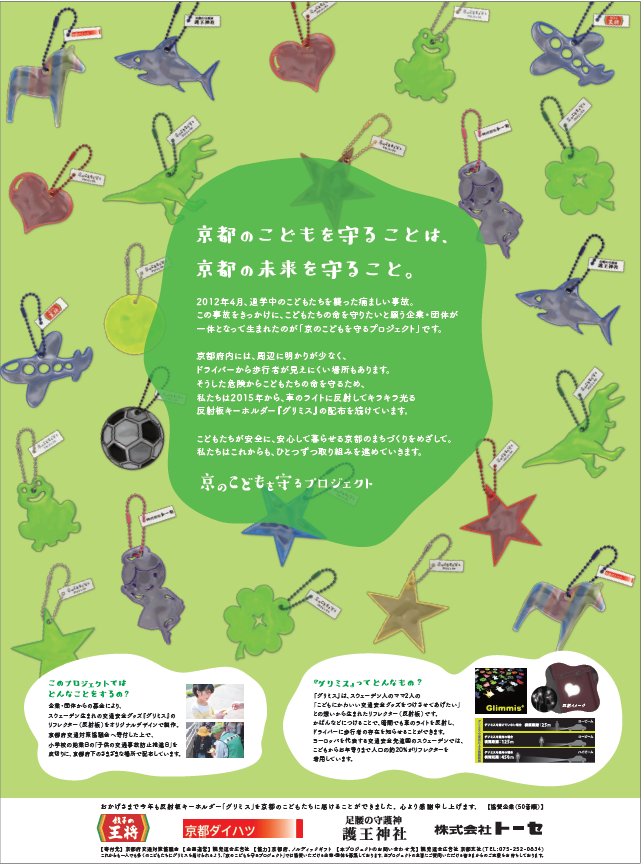 交通安全グッズとしてスウェーデン生まれのリフレクター(反射板)「グリミス」を京都市交通対策協議会へ寄付した上で、9月1日「こどもの交通事故防止推進日」を皮切りに、 京都府内のさまざまな場所で配布しました。